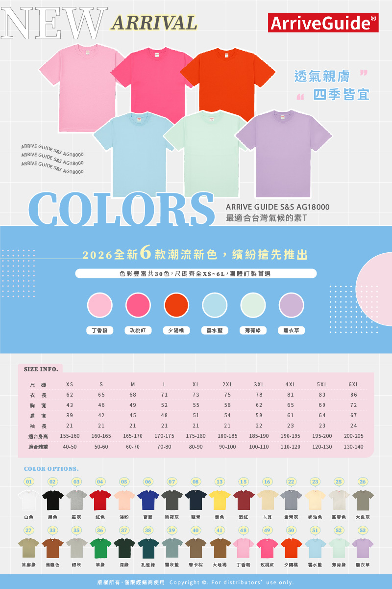 首頁 最新消息 新色報到!讓心情和穿搭一起發光😍 新色報到!讓心情和穿搭一起發光😍 公司公告 2025.11.06 還在找一件「怎麼穿都好看」的素T嗎?🤩🌊透氣親膚 × 四季皆宜AG18000採用高密度賽洛紡頂級精梳棉製成,180g(5.3oz)完美厚度,柔軟又親膚,全天穿著都超舒適🎉全新 6 款夢幻繽紛新色登場!💗 丁香粉|💖 玫桃紅|🧡 夕陽橘|💙 雲水藍|💚 薄荷綠|💜 薰衣草每個色都帶來不同的穿搭靈感,穿上去立刻讓心情升溫、氛圍爆棚 🎨色彩豐富共30色、尺碼齊全XS~6XL通通有,無論是團體服、休閒穿搭都能輕鬆展現你的專屬風格😎不需要多想👉衣庫這件T恤,就是答案😉讓「色彩」成為你每天最有溫度的穿搭宣言 🥰 回上一頁