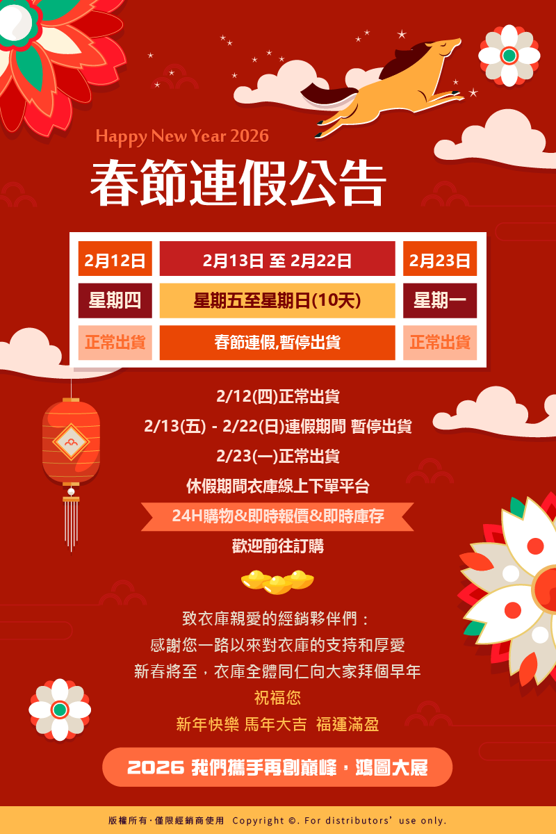 首頁 最新消息 2026春節出貨調整通知 衣庫祝您🐴馬年財源廣進,業務旺旺來💰 2026春節出貨調整通知 衣庫祝您🐴馬年財源廣進,業務旺旺來💰 公司公告 2026.02.06 因適逢春節假期 2/12(四)為貨運最後收貨日2/13(五)~2/22(日) 為春節放假十日我們將於2/23(一)為您服務連假前後因物流業務繁忙 ,無法指定配送日期及時間如有訂購方面需求 ,請提早告知專員☎️造成您的不便還請見諒㊗️衣庫在此祝福您 🐎💰馬騰富貴,財源滾滾來🐎🤑 回上一頁